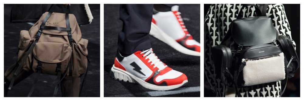 iconici e tipici degli studenti in uniforme, gli accessori completano il look: sneakers bianche con dettagli rossi, cravatte sottili e zainetti sulle spalle in pelle nera e blu o tracolle in nylon verde militare.