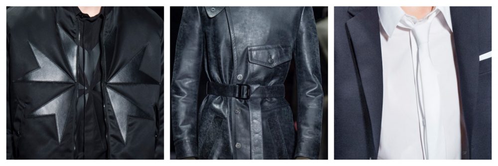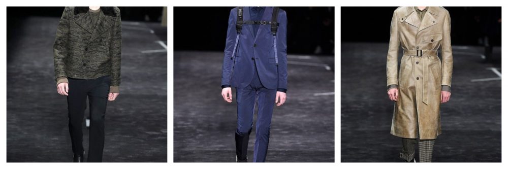 Non mancano gli intramontabili trench con lembi di pistola in pelle, i soprabiti in jacquard mimetico e i pantaloni di motocross in pelle o in velluto a coste, tessuto must-have della stagione invernale.
