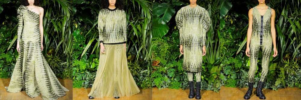 Aigner: colori, stampe, forme, tutto si mixa; un viaggio intorno al mondo e nel tempo, tra ispirazioni orientali, safari e influenze provenienti dagli Anni 70 e 90. Le trasparenze lasciano le spalle scoperte e creano un effetto vedo non vedo su tutta l’immagine. La donna appare quasi una dea della terra e indossa abiti lunghi che lasciano intravedere l’addome. Christian Alexander Beck si è ispirato ad antichi cimeli, tesori privati e oggetti mistici e il titolo che ha dato alle creazioni non poteva essere più azzeccato: Wunderkammer, la “camera delle meraviglie”