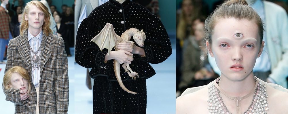 Gucci has made quite some stir with the latest show of RTW Fall/Winter 2018. No surprise, with Alessandro Michele it is always a stir. Pale looking models carrying around replicate of their heads, almost real-looking snakes and dragons in an operation room with operation chair in center resembled ghostly participants of an initiation ritual. Some had third eye on their hands with myriad of ethnic twists to the looks. Some people found it unnerving, some psychic, some awesome, some were confused, some didn’t understand at all. All for a reason.