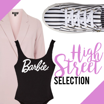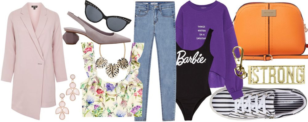 Blazer asimmetrico in soft pink Top Shop € 76.00; crop top con volant e stampa multicolor H&M € 24.99; pumps in pelle scamosciata con tacco geometrico Mango € 59.99; jeans push up lavaggio chiaro Pull&Bear € 19.99; felpa oversize Zara € 12.95; body in cotone organico con logo “Barbie” Bershka € 12.99; tracolla in ecopelle River Island € 43.00; orecchini “Penelope” in resina Accessorize € 12.00; sneakers a righe con cerniera laterale Stradivarius € 19.99; collana con foglie tropicali “Kara” Desigual € 35.95; charm in metallo dorato Pinko € 35.00; occhiali da sole a gatto Pimkie € 9.99.