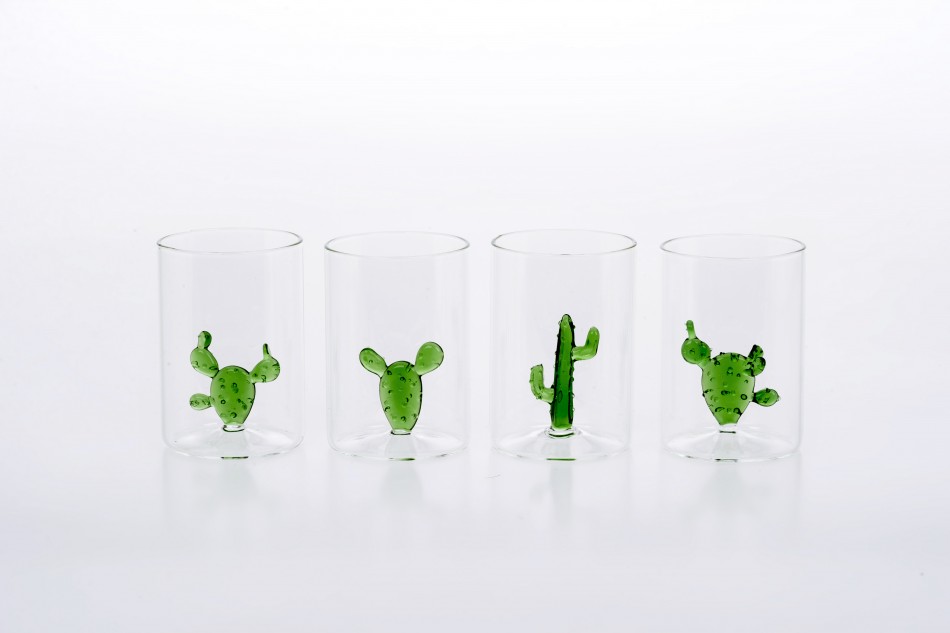 #6 La magia del vetro. Apparentemente semplici bicchieri, sono in realtà pezzi di design divertenti e di classe. Il set è fatto a mano in quel di Venezia e sposa l’antica tecnica del vetro soffiato. Ogni bicchiere ha, al suo interno, un cactus sempre diverso di colore verde.