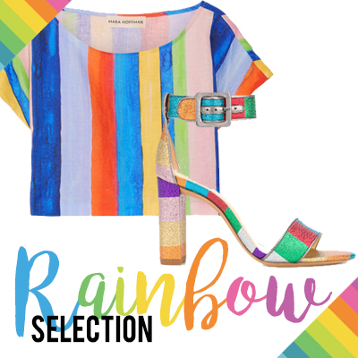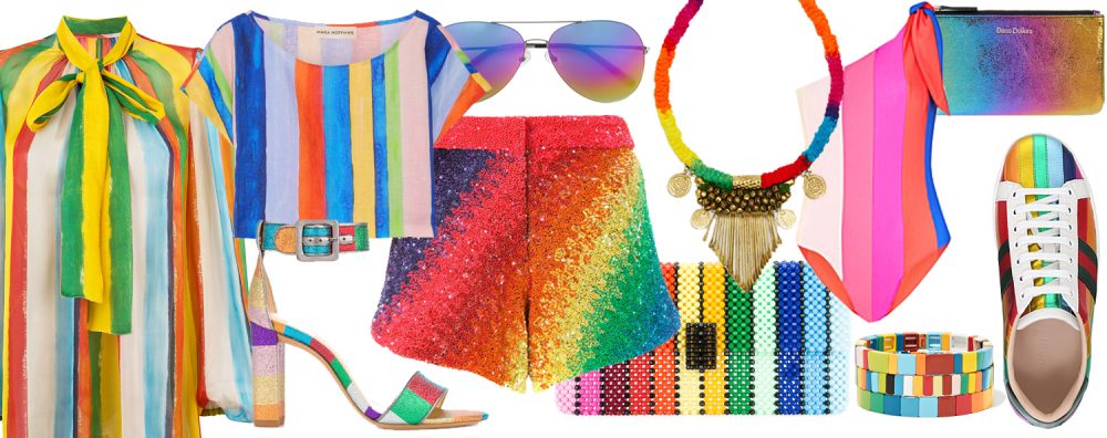 Se non volete caricare i vostri abiti di colore, perché proprio non ve la sentite di girare per le strade eccessivamente variopinte, una buona scelta potrebbe essere quella di optare per accessori arcobaleno come le sneakers “Ace” di Gucci, gli occhiali da sole aviator con lenti multicolor di Matthew Williamson o i sandali “Rainbow” di Alexandre Birman. In spiaggia, l’arcobaleno è più easy to wear: si può optare per un telo mare rainbow, un cappello in paglia con banda multicolor o un costume a pezzo unico, come quello monospalla di Paper London. Può sembrare un arcobaleno, ma anche un tramonto californiano: parliamo della mini pochette metallizzata “Disco Dollars” di Accessorize, un pezzo SLG che chiama subito l’estate! Le più audaci potrebbero indossare degli shorts dei quali ci siamo proprio innamorati, ovvero quelli interamente glitterati firmati Manish Arora. Hanno anche un crop top in match, ma noi li vediamo bene con una canotta sportswear bianca e magari qualche accessorio strampalato. Il vostro guardaroba è pronto per un’estate arcobaleno?