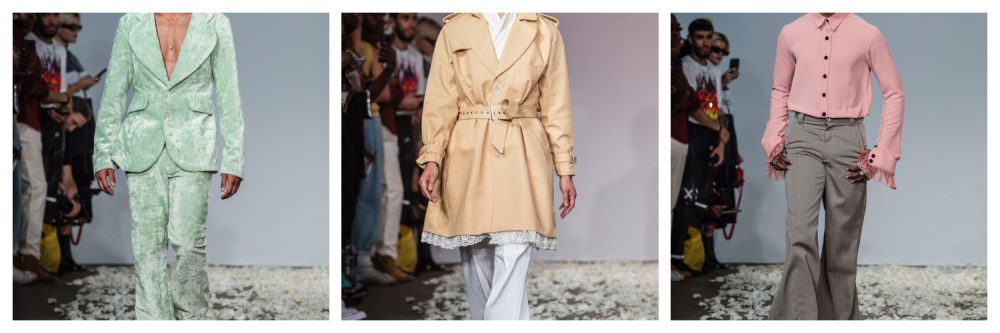 Kenneth Nicholson: parola d’ordine? No gender. Il designer Kenneth Nicholson, dopo aver frequentato l’Accademia d’arte di San Francisco, ha trascorso un anno in marina, un’esperienza che ha radicalmente cambiato la sua visione dell’abbigliamento maschile, portando in passerella abiti ispirati sia alle uniformi militari che ai costumi del 18° secolo. “Storicamente, gli uomini non sono stati limitati solo a una camicia e ai pantaloni. Hanno avuto più opzioni”, ha commentato Nicholson. Il designer ha diviso la sua collezione in tre capitoli. Il primo è caratterizzato da capi declinati nelle diverse tonalità del bianco, colore tramite il quale voler esprimere tristezza e malinconia: camicie in pizzo abbinate a pantaloni a vita alta o maglie in cotone e lino a maniche lunghe impreziosite da dettagli regali. Il secondo capitolo si ispira agli anni ’70 con camicie in denim, trench decorate con bottoni preziosi e pantaloni colorati. Il nero è il colore protagonista dell’ultimo capitolo ed è stato declinato su cappotti, camicie di velluto e pantaloni decorati con dettagli in raso e in pizzo.