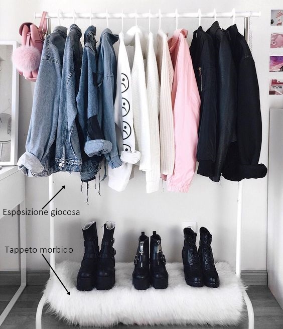 Non serve avere moltissimo spazio, basta uno stand appendiabiti bianco e i capi organizzati con criterio. Prima il denim, poi la maglia, infine il chiodo di pelle. E’ divertente giocare come fosse l’esposizione di un negozio, accessori inclusi. La zona armadio può così rimanere a vista e diventare elemento d’arredo. Non dimenticate il morbido tappeto bianco, rende l’insieme molto cool!