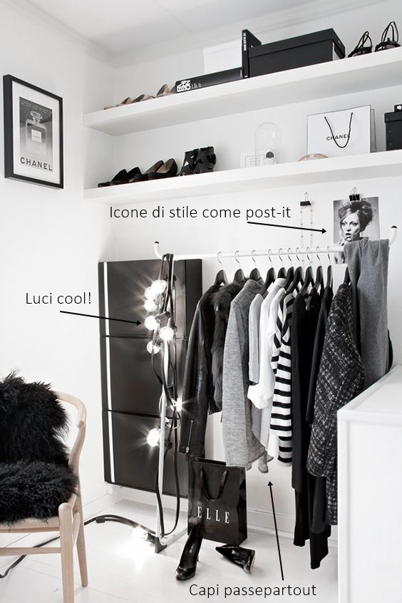 L’essenziale black&white apre le porte a luci ben studiate, a mensole porta accessori, e a stand che ospitano capi passepartout da indossare al volo quando siamo di fretta. Immancabile la cassettiera in cui riporre i capi per colore, così da poter comporre i look con facilità. L’idea: come fossero post-it, appendi alla parete le immagini delle dive alle quali vuoi ispirarti!