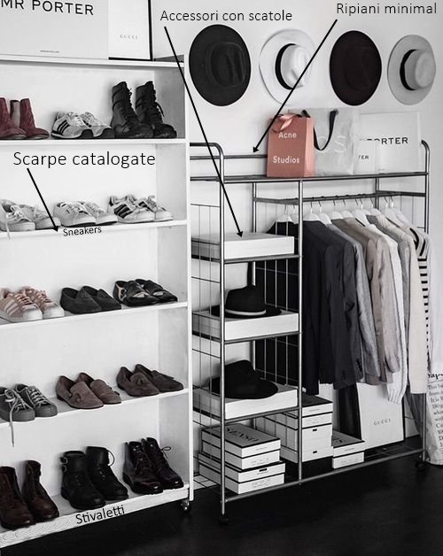 E’ un po’ come giocare a Tetris o amare la geometria. Le linee rette trasmettono pulizia, per cui è bene scegliere scaffalature minimal senza troppi fronzoli, da riempire con criterio. Nello scaffale con le mensole vanno le scarpe (potete eventualmente segnalare, ripiano per ripiano, la tipologia di scarpa che andrà posizionata), nello stand, invece, vanno abiti e accessori, meglio se accompagnati dalla loro scatola.