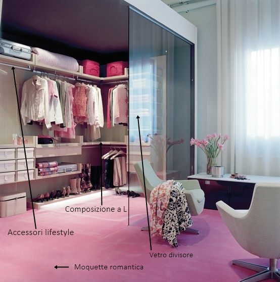 Un vetro trasparente consente di separare la cabina armadio dal resto della stanza. Iperfemminile, questa soluzione prevede moquette rosa e pareti di una nuance più tenue. I ripiani sono composti a L e accolgono, oltre all’abbigliamento, accessori lifestyle come le valigie, piumoni e la beauty routine. Carina l’idea di ricreare i cassetti con le scatole (in commercio ne esistono davvero di bellissime), e, anche qui, il consiglio è di comporre il tutto con logica, appendiabiti e cassetti vanno disposti in modo armonioso.