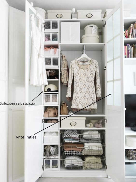 Se avete poco spazio, potete sfruttare un angolo della stanza e posizionarvi un mobile suddiviso in tante sezioni. Per utilizzarlo al massimo ricorrete a soluzioni salva spazio, ad esempio ripiegate i pantaloni a mo’ di rotolo (su youtube esistono tutorial a riguardo) o rendete micro le t-shirt. Per camuffare l’angolo chiudetelo con ante dallo stile inglese, sarà come aprire la porta delle meraviglie!