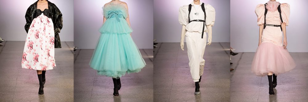Nicola Brognano ha un tratto che diventa sempre più riconoscibile e pare che le sue collezioni siano collegate fra loro, che facciano parte di un unico discorso. L’ultima presentata a Milano Fashion Week, sembra, infatti, la seconda parte della PE 2019. Qual è la firma di Brognano? L’unione di romantico e street; di punk e couture. “Une Journeè a Versailles” indica la stampa riportata su una camicia. Una Versailles settecentesca con un sottofondo di The Strokes, Cure e Siouxsie and the Banshees, come quella proposta dalla pellicola di Sofia Coppola su Maria Antonietta. Fiori delicati su volumi over con giacconi in pelle cocco; maniche a palloncino con backpacks. Tulle stratificato in rosa ballerina, in contrasto col nero. Caramelle e metropolitana.