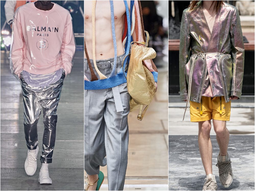 Che si tratti di un dettaglio, di un accessorio o di un capo, il laminato è un elemento che rende un outfit immediatamente super cool. Da Balmain il metallizzato è un po’ all over. A noi sono piaciuti moltissimo i pantaloni con cavallo basso argentati, che sono stati abbinati ad una felpa logo rivestita in PVC. JW Anderson opta per il dorato sulla tote bag morbida da portare a mano, mentre da Rick Owens un blazer kimono con maxi tasche ad effetto invecchiato.