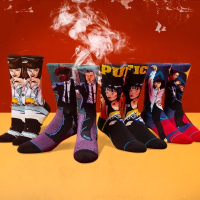 I quattro motivi a tema “Pulp Fiction” possono essere rintracciati in quattro delle scene più memorabili della pellicola: un calzino riprende l’immagine del film in cui Uma Thurman, che interpreta la parte di Mia, si trova distesa su un letto, fumando una sigaretta; un altro mostra un disegno di Mia seduta in una cabina a bere un frappè; un’altra versione raffigura Samuel L. Jackson e John Travolta con le pistole in mano contro uno sfondo verde e viola.