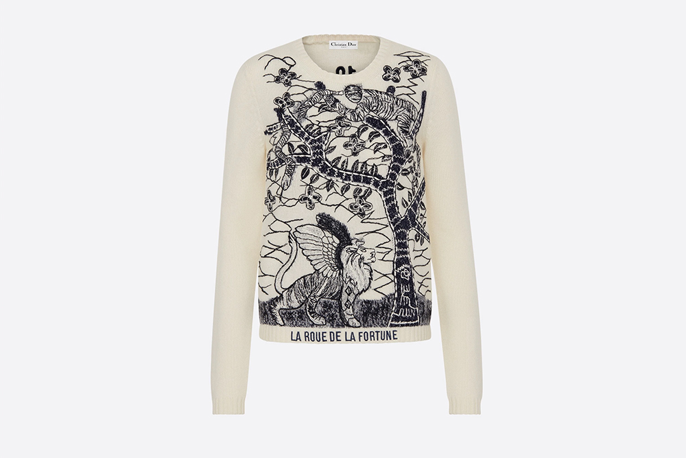Il decimo e ultimo fra i miei regali, rappresenta anche il decimo fra gli Arcani Maggiori, ovvero “La ruota della fortuna” impressa in questo morbido pull in cachemire e seta firmato Dior. La tessitura in stile intarsio raffigura la carta dei tarocchi, mentre sulla parte posteriore è rappresentato il numero dieci. Un pezzo veramente ricercato, che sopravviverà nel guardaroba per stagioni e stagioni grazie al suo taglio classico.