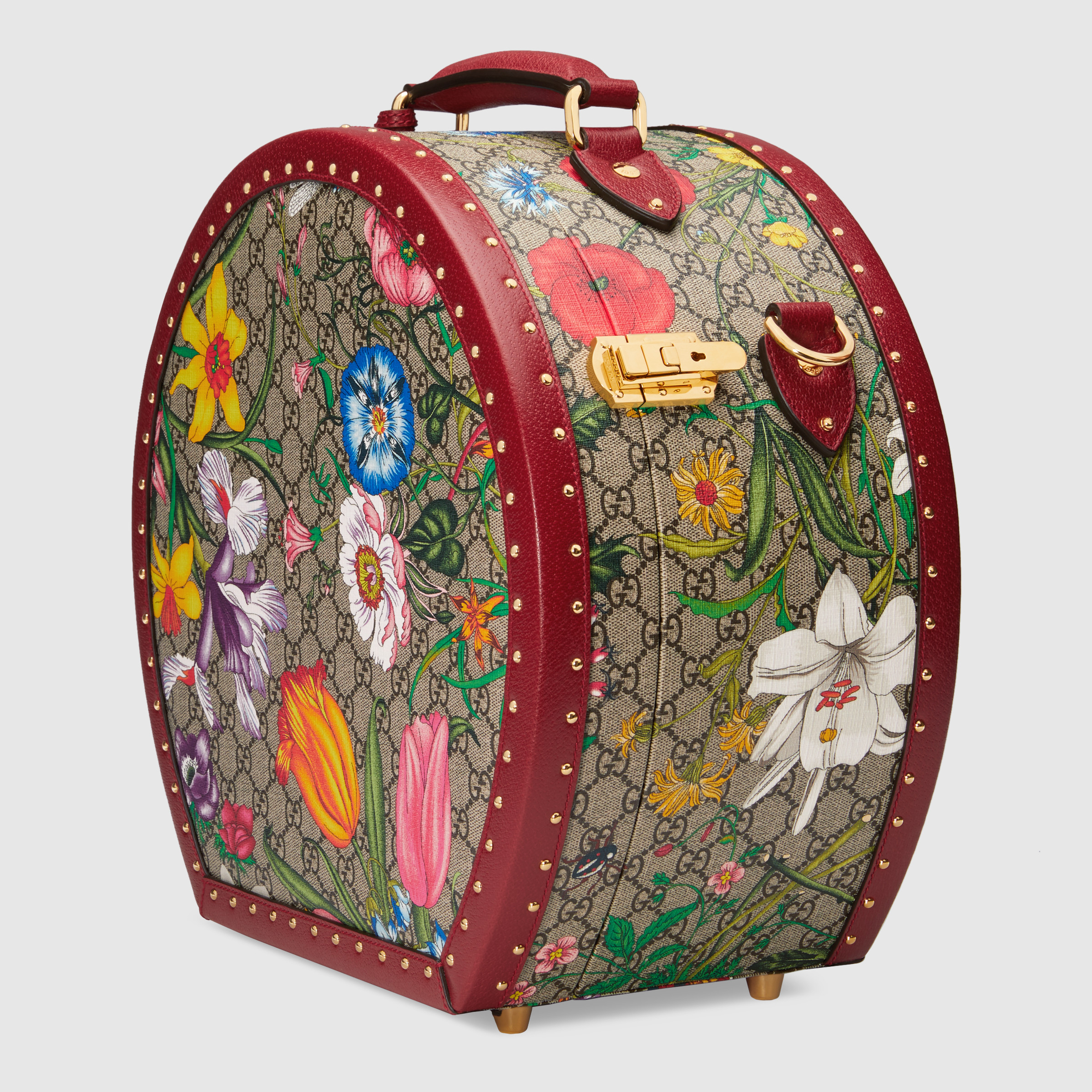 Vi piace la nuova stampa flora di Gucci? Qualcuno si sente annoiato, a me non ha ancora sortito lo stesso effetto, infatti la adoro. Trovo sia anche più bella della primissima Bloom lanciata con l’arrivo di Alessandro Michele. Nonostante sia una novità di questa stagione, si tratta, in realtà, di un motivo creato negli anni ’60 da Vittorio Accornero. Ciò che mi fa davvero venire gli occhi a cuore è l’unione dei print Supreme di Gucci a quel vintage che non stanca mai, ovvero lo stile dei vecchi bauli da viaggio. Questa cappelliera ha una bellissima bordatura in pelle rossa, con finiture in color oro. Si può portare a mano o a tracolla, ed è anche dotata di tasche interne ed uno specchio. La a.m.o.!
