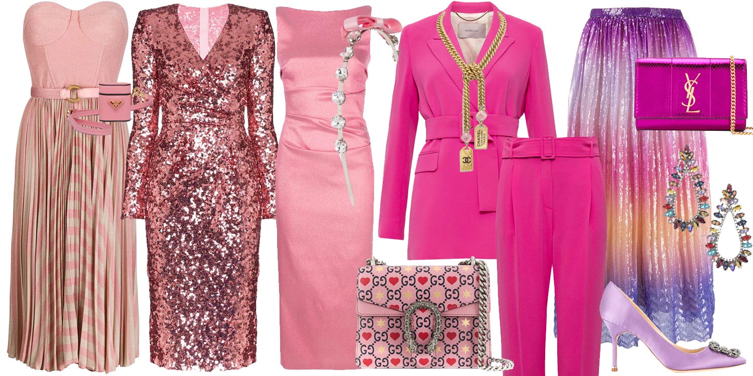 Abito strapless con gonna plissettata, Elisabetta Franchi € 549.00; abito midi a portafoglio con paillettes, Dolce&Gabbana € 1.950; midi dress a tubino in lamè, Talbot Runhof € 1.139; completo composto da blazer e pantalone in crepe, Marella € 259.00 (blazer) € 129.00 (pantalone); gonna midi con sfumatura effetto Sunset e paillettes, Marco De Vincenzo € 950.00; borsa a tracolla “Dionysus Valentine’s Day”, Gucci € 1.980; pumps “Hangisi” con dettaglio gioiello, Manolo Blahnik € 1.171; clutch con catena “Kate”, Saint Laurent € 1.950; cerchietto con cristalli e fiocco, Miu Miu € 430.00; porta airpods, Prada € 350.00; collana con catena e cristalli rosa, Chanel € 1.090; orecchini pendenti multicolor con cristalli sintentici, Aldo € 18.00.