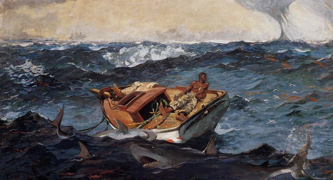 Autentica icona di stoicismo dolente e d’attesa senza rassegnazione, che vede un marinaio africano sopravvissuto alla tempesta che ha disalberato la sua imbarcazione da pesca, volgere quasi eroicamente lo sguardo, senza dar attenzione agli squali famelici che si affollano assetati di sangue ai fianchi dello scafo, e che hanno già divorato – con grande probabilità – il resto dell’equipaggio, come sembrano rivelare le chiazze rosse sui flutti del mare in burrasca, la celeberrima tela dell’artista statunitense Winslow Homer ( Boston 1836, Prout’s Neck 1910 ) La Corrente del Golfo, realizzata nel 1899, tanto iconica e mille volte riprodotta in patria quanto sconosciuta, o quasi, in Italia, sembra esser una perfetta epitome ideale delle brutali violenze e del dilagante movimento d’opinione, conseguente all’omicidio dell’afroamericano George Floyd ad opera delle  forze di polizia statunitensi.