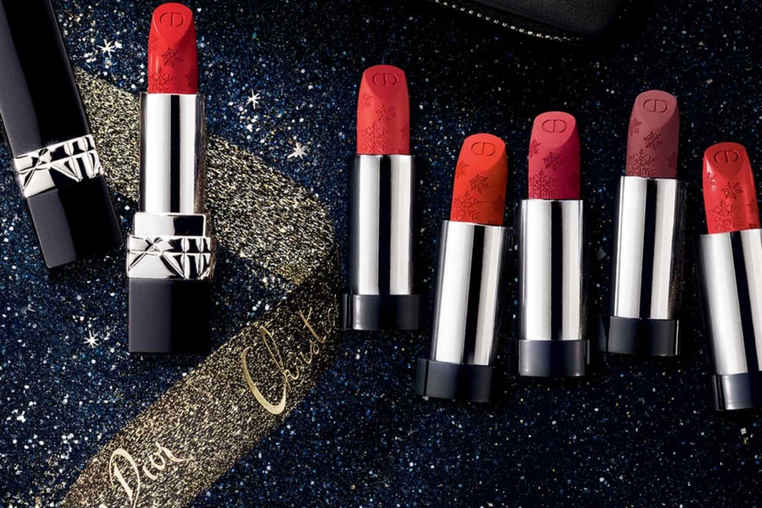 Non dimentichiamoci delle labbra. Il rossetto Rouge Dior nell’edizione limitata Golden Nights, valorizzato da fiocchi di neve, presenta i rossi più iconici della Maison.