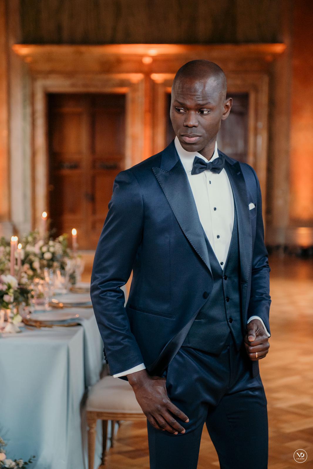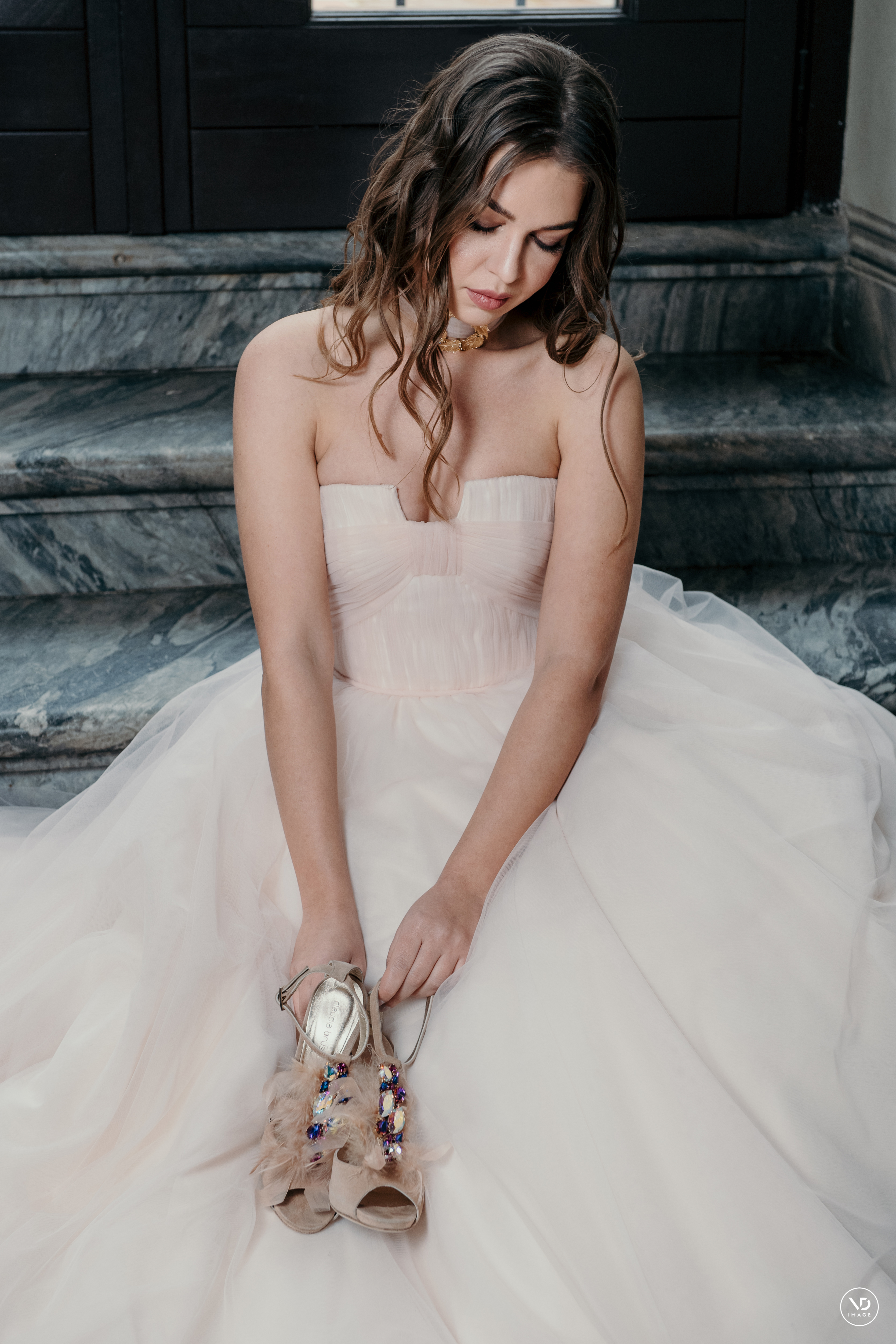 “In questo shooting ho curato la ricerca del trucco e dell’acconciatura in base alla lunghezza dei capelli, la forma del viso e dell’occhio. L’abito è sui toni del rosa, come si vede nell’allestimento, una scelta mirata a non creare troppo contrasto fra i colori. Anche l’abito dello sposo è stato scelto un blu luminoso per non incupire troppo l’incarnato dello sposo. Ho scelto scarpe moderne da sposa, per dare un pò di grinta e carattere alla sposa” – Tamara D’Andria