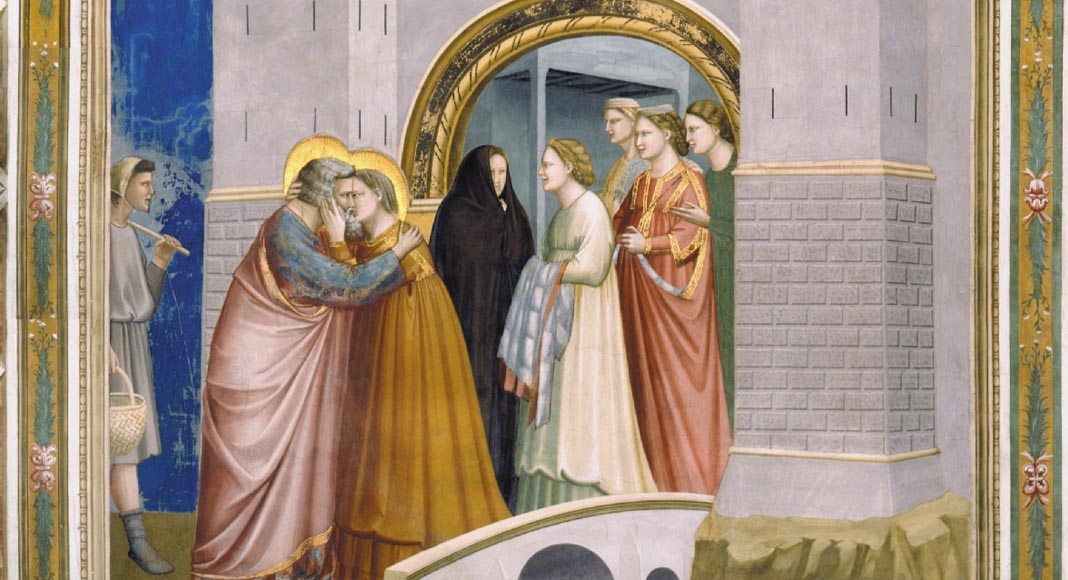 Per quanto ispirato e formato dai grandi maestri della Scuola Romana della precedente generazione, come Filippo Rusuti, Jacopo Torriti e soprattutto il geniale Pietro Cavallini, Giotto infonde alle sue figure una nota ancor maggiore d’autenticità umana e immediatezza popolaresca, in buona parte desunte dalla conoscenza della statuaria classica e delle opere del contemporaneo Arnolfo da Cambio, che contribuiscono a conferire potenza drammatica e intensità emotiva al Compianto sul corpo di Cristo come all’incontro dolcemente appassionato di Gioacchino ed Anna – i genitori della Vergine – alla Porta Aurea di Gerusalemme, dove il sublime particolare delle mani della sposa che accarezzano la gota di Gioacchino e ne serrano la nuca brizzolata nel bacio – insieme casto e appassionato dei due coniugi – segna un vertice assoluto che ispirerà con riconosciuta evidenza l’arte a venire.