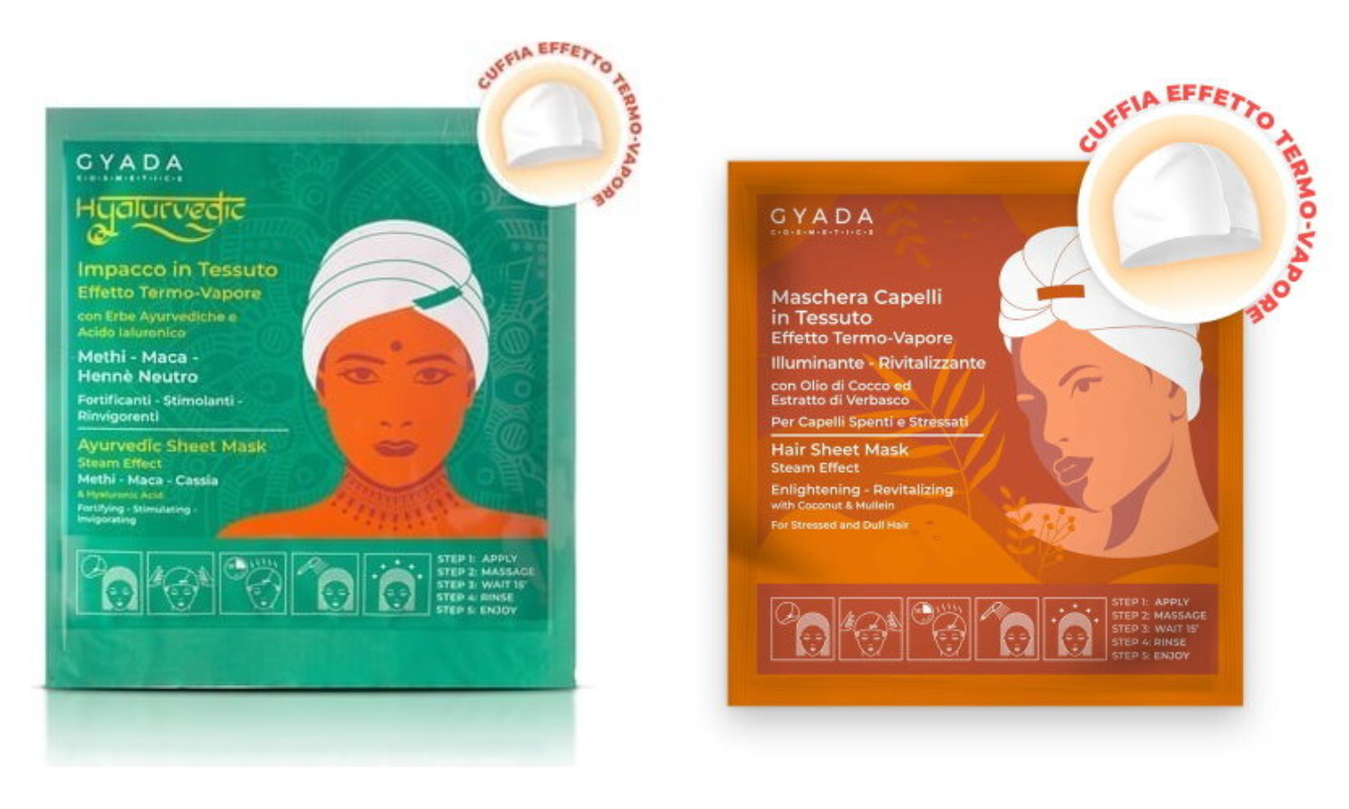 Gyada Cosmetics firma alcune delle migliori maschere naturali del momento. Si tratta di maschere impacco in tessuto che, come nel caso della linea Hyalurvedic, non solo ritemprano la chioma ma la impreziosiscono con riflessi colorati.