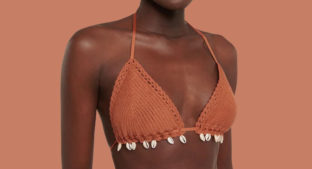 Bikini a triangolo “Andie” in crochet con piccole conchiglie pendenti, Zimmermann; bikini crochet con ricamo floreale, Cult Gaia; bikini con top a fascia multicolor in crochet, Alanui; bikini con culotte in crochet, Valentino; bikini a triangolo in spugna di cotone, Lisa Marie Fernandez.