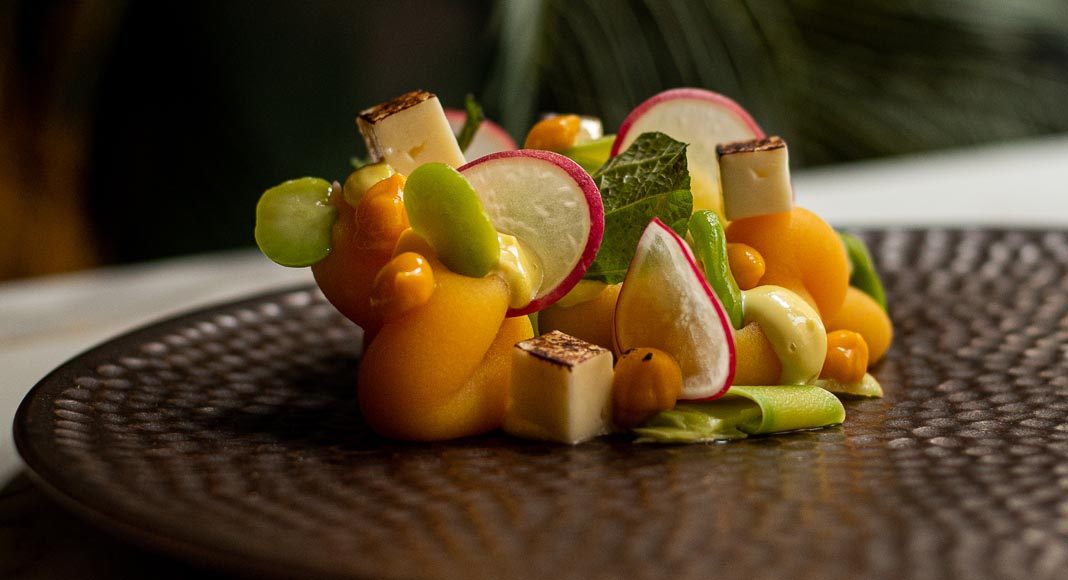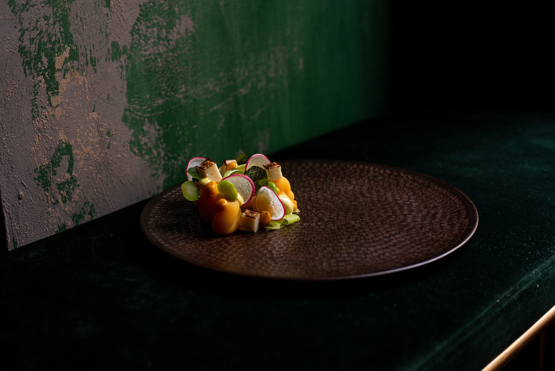 Sbollentare le patate in acqua salata. Sbucciare e passare al setaccio da calde. Lasciare raffreddare. Aggiungere la pasta di aji amarillo, il succo di yuzu, il sale e l’olio evo q.b. Impastare. Lasciare raffreddare in frigo per due ore. Nel frattempo, tagliare a lamelle per lungo le zucchine Trombetta. Sbianchire in acqua salata. Scolare e mettere subito in acqua e ghiaccio. Sbucciare le fave. Sbianchirle. Metterle in acqua e ghiaccio. Pelarle. Tagliare i ravanelli e metterli in acqua e ghiaccio, per far sì che diventino croccanti. Con un minipimer, frullare i tuorli, l’aceto di vino bianco e il sale. Aggiungere la pasta di wasabi e, a filo, l’olio di girasole. Riservare da parte. Sbucciare e setacciare la lucuma. Montare con olio e acqua q.b., per ottenere una simil-maionese. Tagliare il formaggio a cubetti. Condire le lamelle di zucchine con olio e sale Maldon. Impilare. Fare piccoli vortici di sac à poche con l’impasto di aji amarillo. Aggiungere le fave, i ravanelli, i cubi di primo sale bruciati al cannello e le due maionesi di wasabi e lucuma. Condire con sale Maldon e foglie di shiso rosso.