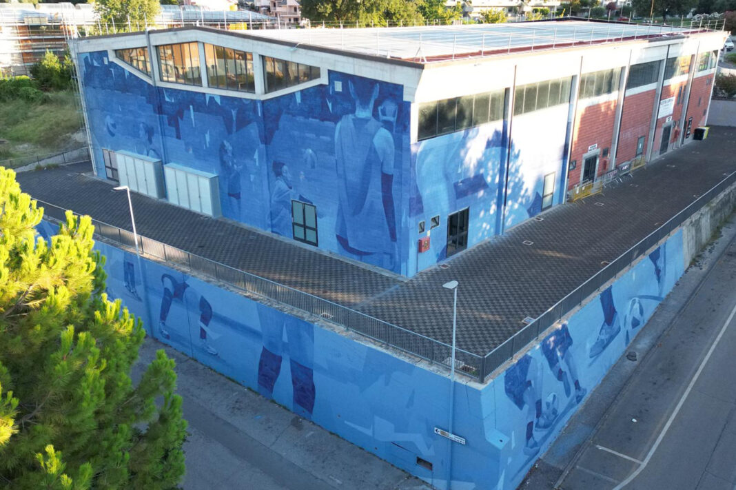 “Il concept di Atleti in armonia prende ispirazione da fotografie scattate all’interno dell’edificio che lo ospita, ritraendo giocatori di calcio indoor e di pallavolo. La palette di blu viene utilizzata per armonizzare le diverse immagini degli atleti. Le loro figure rappresentano la dedizione, la passione e lo spirito di squadra che animano la palestra. La scelta di utilizzare il blu come filo conduttore crea una sensazione di unità e coesione tra le diverse discipline sportive, riflettendo l’importanza della collaborazione e del sostegno reciproco per raggiungere gli obiettivi comuni. Questo murale si propone di celebrare e valorizzare gli atleti che si allenano e competono all’interno della palestra, trasmettendo un messaggio di incoraggiamento e motivazione a tutti coloro che frequentano il complesso. La rappresentazione artistica degli sportivi in azione, unita alla scelta cromatica, contribuisce a creare un ambiente stimolante e accogliente per gli atleti, i visitatori e la comunità”.