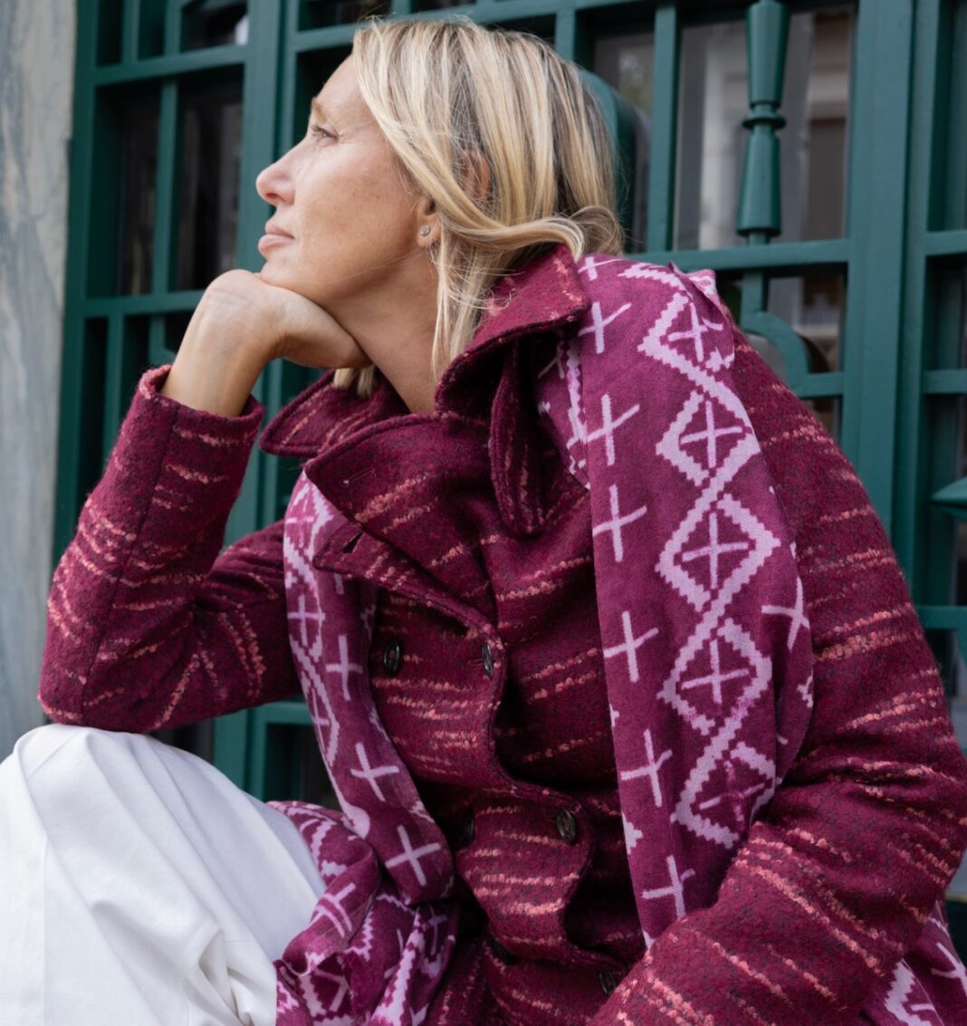 Da questo punto di vista, Toosh può offrire ottimi esempi dalla sua nuova collezione autunno inverno. Un primo abbinamento ideale per la stagione fredda vede come protagonista il colore blu melange, declinato nell’iconico Cappotto Lucrezia e ripreso anche dalla particolarissima Stola Arrows, realizzata con pregiato e caldissimo cashmere extra-sottile, unendo tradizione, eleganza ed ecosostenibilità.