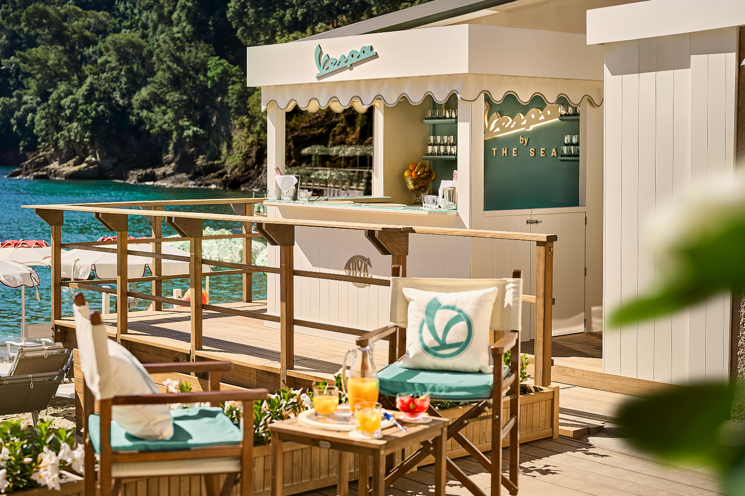 Un take-over discreto, non invasivo, posizionato strategicamente al centro della baia di Paraggi con una vista frontale unica. Nei colori del bianco e del turchese, scorgiamo gli arredi logati: lettini, ombrelloni, teli mare, cuscini, tavoli bicchieri e vassoi. A completare l’esperienza, la nuovissima partnership con Cova Montenapoleone che ha creato, in collaborazione con Vespa, una cocktail list dedicata all’aperitivo, disponibile nell’esclusivo chiosco Vespa che si adagia su una piccola terrazza che sembra tuffarsi nel mare.