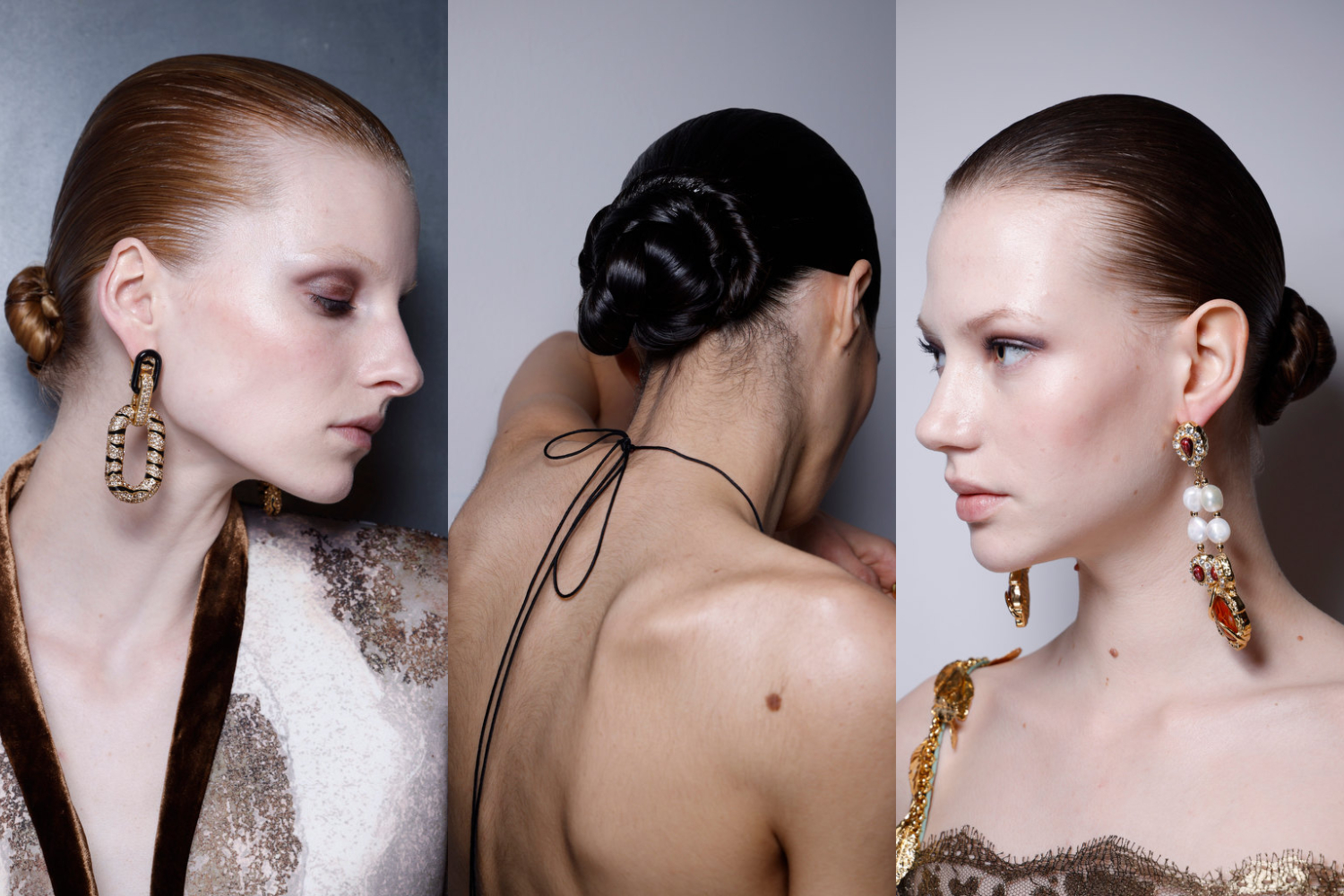Non vi nascondo che è il mio preferito; Raccolti perfetti e lucidi, code e chignon tiratissimi e ultra sensuali. Roberto Cavalli ne è il fulgido esempio. Per una collezione intitolata Pompeii Future, si affida alle sapienti mani di Damien Boissinot, per ghd, per realizzare raccolti eleganti, grintosi e audaci. “L’idea era di bilanciare l’eleganza con un tocco di sensualità contemporanea, creando un’acconciatura che fosse sofisticata e potente.”