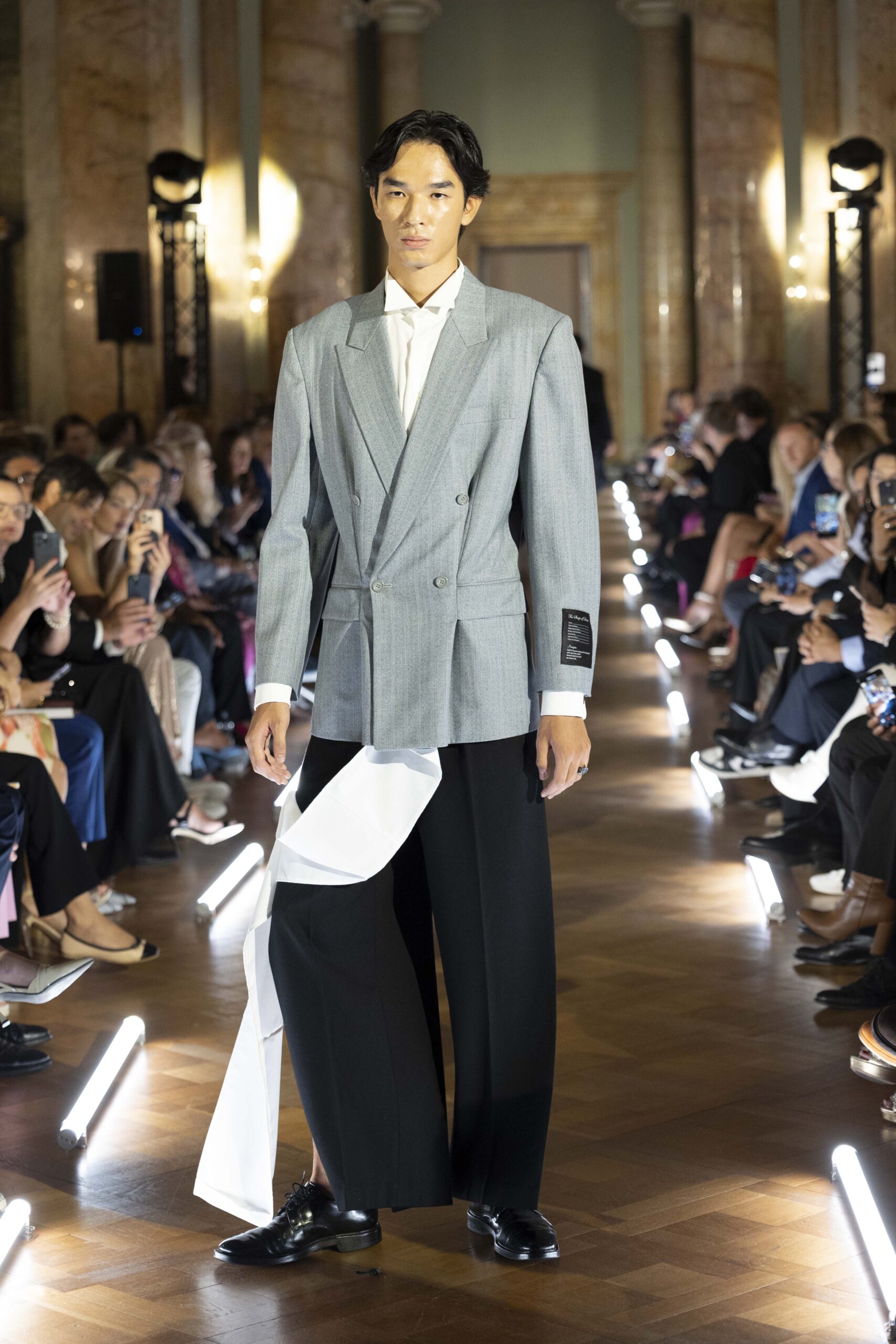Sfilare a Roma ha aggiunto un livello di lettura ulteriore. La città che ha codificato l’idea di classicità è diventata il luogo in cui la tradizione ha incontrato il futuro sostenibile. Tra colonne e scaffalature storiche, l’architettura sartoriale di Surowiec ha trovato un contrappunto naturale. La monumentalità dell’ambiente ha imposto di misurare linee e proporzioni con una scala più alta. I tagli maschili e le forme strutturate hanno sostenuto lo sguardo, hanno retto la distanza, dialogando con la verticalità degli spazi. Il passaggio a Roma ha funzionato da certificazione implicita, perché in Italia il valore del fare bene, della mano, dell’etica applicata alla forma incontra un pubblico competente, abituato a leggere la qualità oltre la superficie.