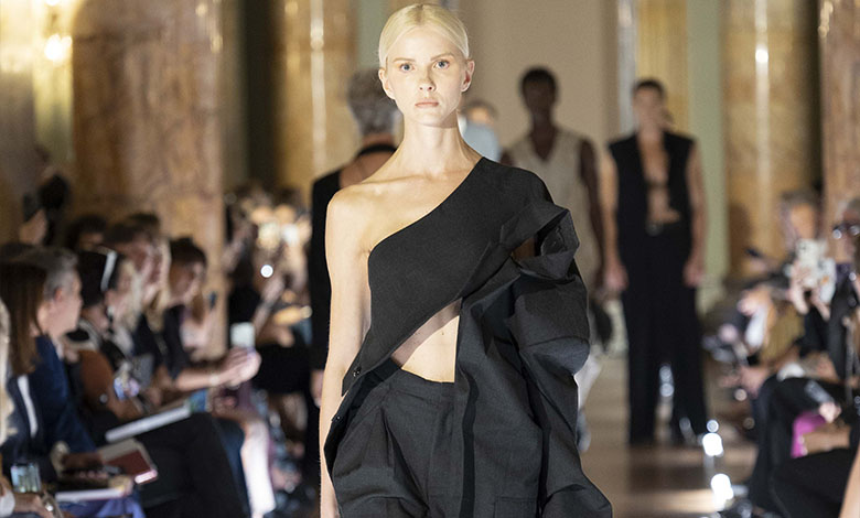 Il nero è stato il suo alfabeto, la luce il suo accento. In passerella la luminosità è arrivata per contrasto attraverso finiture lucide, inserti che hanno riflesso, fili metallici, micro bagliori che hanno disegnato il movimento. Il risultato è stato un lessico contemporaneo che ha tenuto insieme rigore e poesia.
