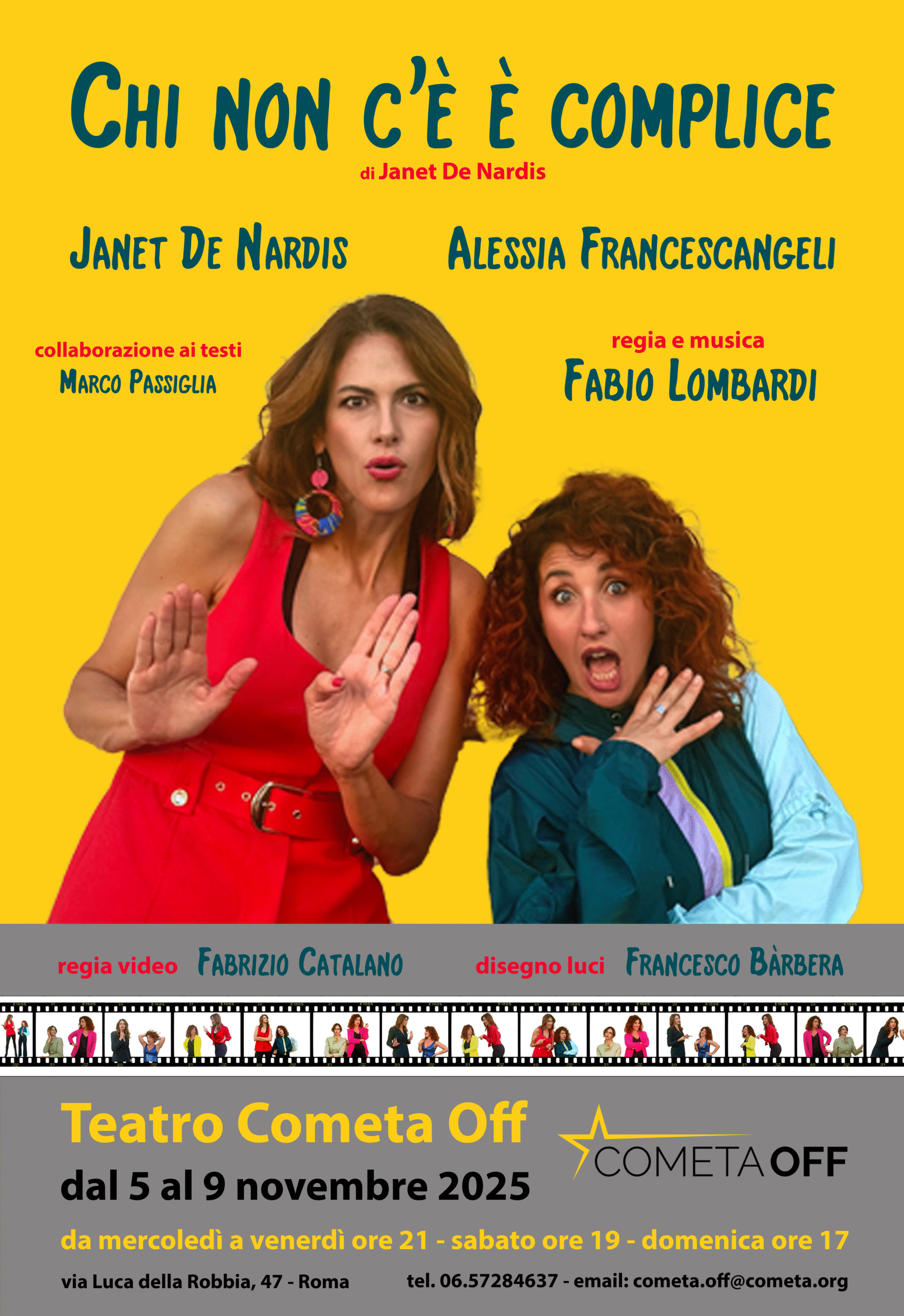 Debutta a Roma la nuova commedia “Chi non c’è è complice”, un testo brillante e pungente firmato da Janet De Nardis, in scena dal 5 al 9 novembre 2025 al Teatro Cometa Off. Dopo il successo del suo film “Good Vibes”, la regista, giornalista e attrice torna al teatro con un progetto che unisce ironia e riflessione, raccontando le contraddizioni e le meraviglie dell’universo femminile.