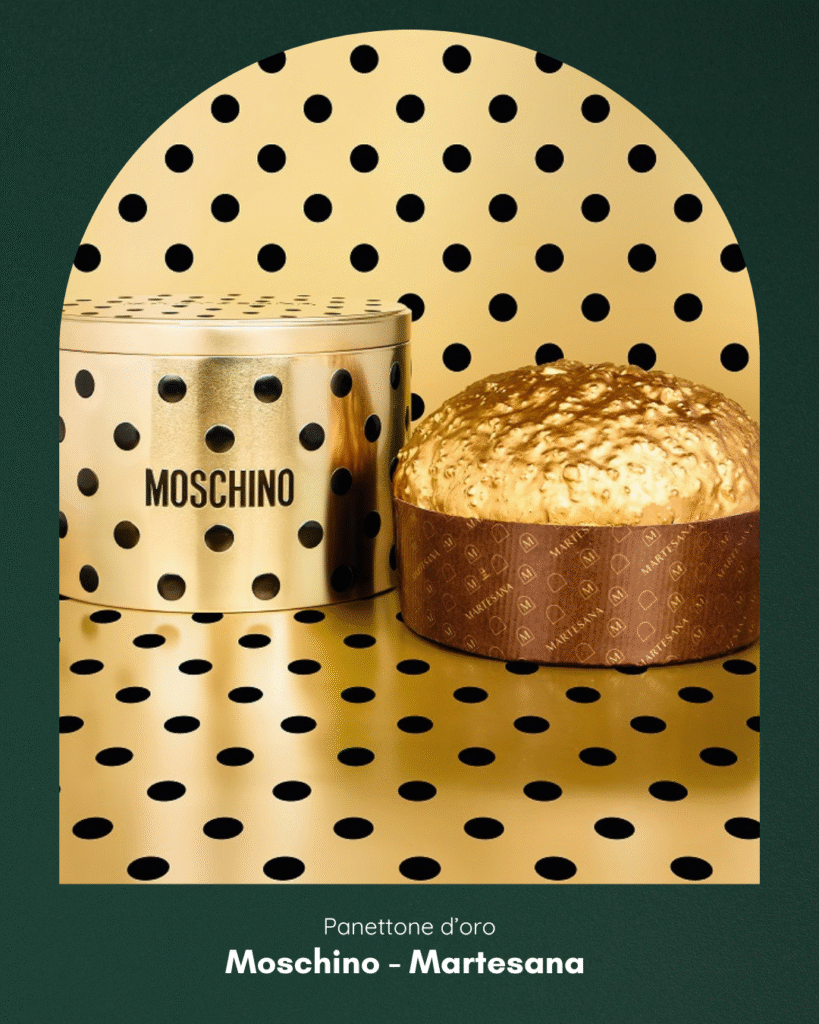 Da Moschino il panettone luxury con glassa al cioccolato gold, granella croccante e nocciole IGP Piemonte in collaborazione con i pastry chef dell’Alta Pasticceria Tre Torte Gambero Rosso. L’antica ricetta di Martesana è espressione pura di Made in Italy con la sua lenta lievitazione con lievito madre, uvetta golden, arancia italiana candita e vaniglia Tahiti. Vogliamo parlare del pack? Una cappelliera dorata con pois neri, ispirato alla collezione fall winter 2025 di Moschino. Un oggetto da collezione e da esposizione che riusciamo subito a visualizzare fra gli scaffali di un’elegante cabina armadio. Decisamente instagrammabile!