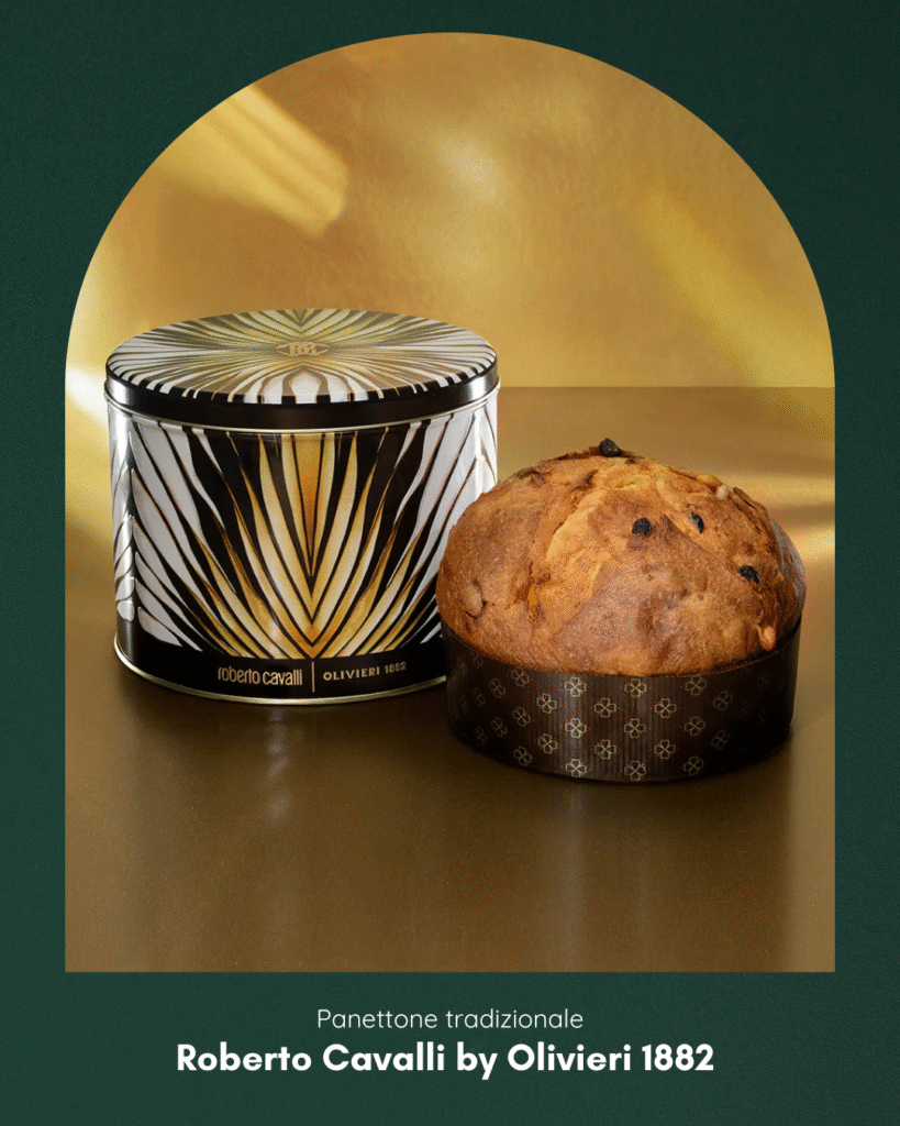 Si chiama “Superclassico” il panettone firmato da Roberto Cavalli in collaborazione con Olivieri 1882. La ricetta, quella più amata da tutti: uvetta, arancia, vaniglia Bourbon. Il packaging in latta con stampa iconica è assolutamente luxe, con quel tocco esotico/aggressivo che definisce l’estetica del brand.