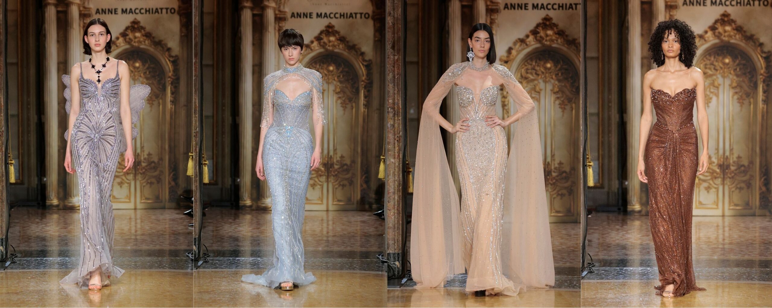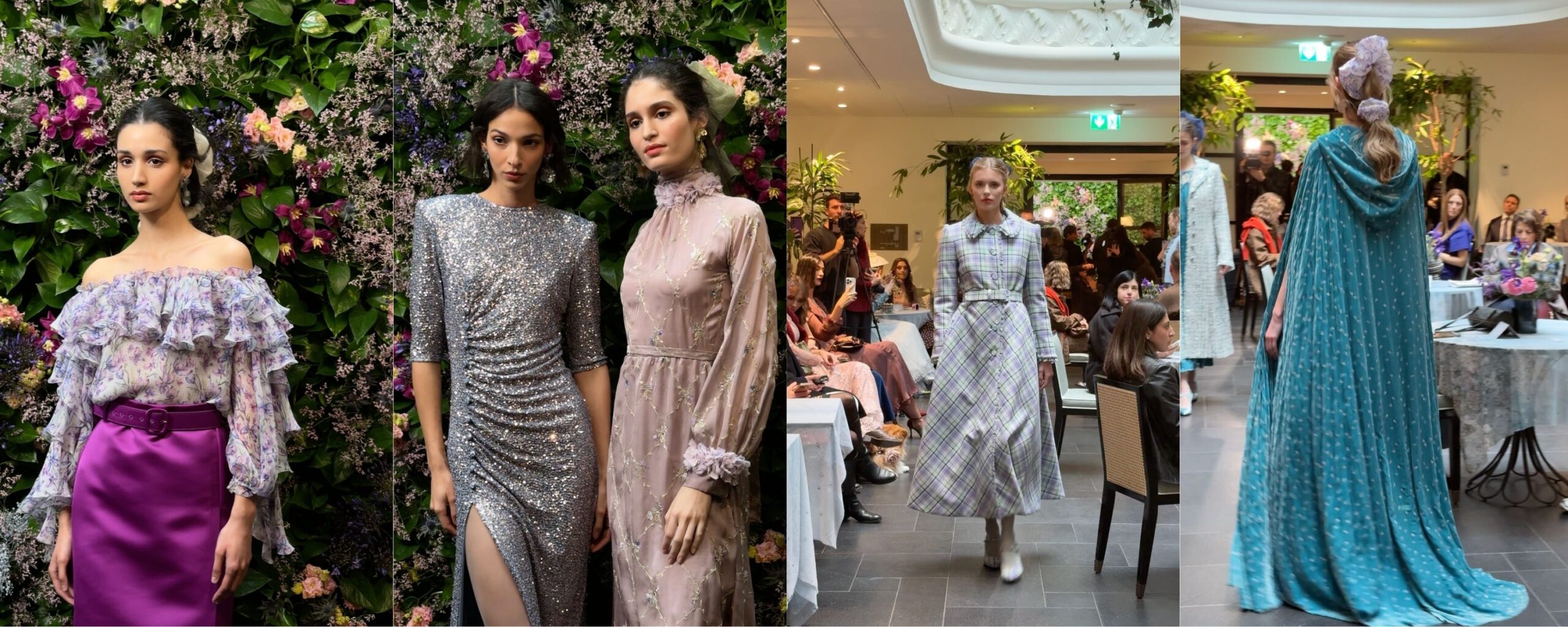 Durante la sfilata ho avuto la sensazione di assistere a un racconto intimo, fatto di forza silenziosa e delicatezza. Le silhouette sono scultoree con spalle decise e gonne stratificate che danno struttura senza irrigidire. Mi ha colpito il dialogo tra artigianalità orientale e minimalismo italiano, evidente nei ricami, nelle perline tridimensionali, nelle frange che si muovono leggere. Pezzo forte i completi in velluto che esprimono a pieno l’idea di creare un ponte fra la tradizione orientale e la sartorialità europea. La palette, tra toni profondi e accenti luminosi, accompagna una femminilità consapevole, mai eccessiva. Vera chicca del fashion show le piccole modelle e i piccoli modelli, di un’età compresa direi dai quattro ai tredici anni. I volti di tutti i presenti si sono illuminati. Carismatici, simpatici e con una personalità fortissima. I bambini portano davvero quel tocco di magia in ogni cosa.
