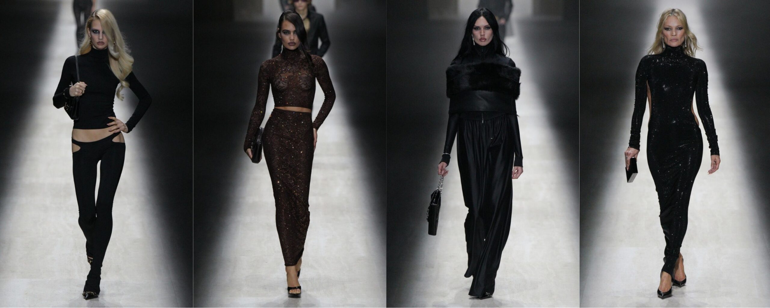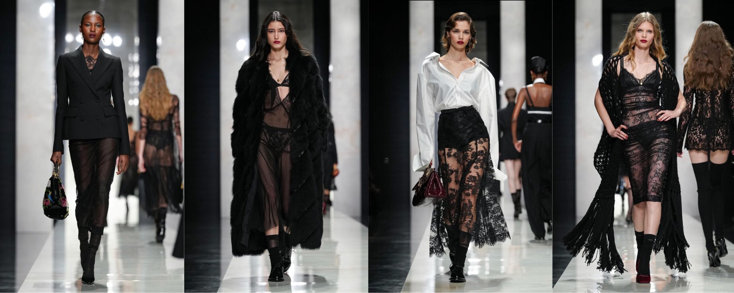 Il nero è stato ovunque in questi giorni, ma nessuno lo ha valorizzato con la stessa forza e coerenza della maison: qui non è mai stato piatto, né banale, ma carico di identità, sensualità e memoria. In front row c’era anche Madonna, presenza silenziosa ma simbolica, perfettamente in sintonia con l’estetica della collezione. Tra i look che mi sono rimasti più impressi ce n’è uno in particolare: la modella indossa un lungo scialle in maglia con frange che, da siciliana, mi ha riportata immediatamente alla “sciallina” delle nonne. Un capo profondamente radicato nella tradizione, qui trasformato in qualcosa di assolutamente glamour e teatrale. È in questi dettagli che Dolce & Gabbana riesce ancora a fare la differenza: prendere un simbolo intimo, quotidiano, e portarlo in passerella senza snaturarlo, ma amplificandone il potere evocativo.