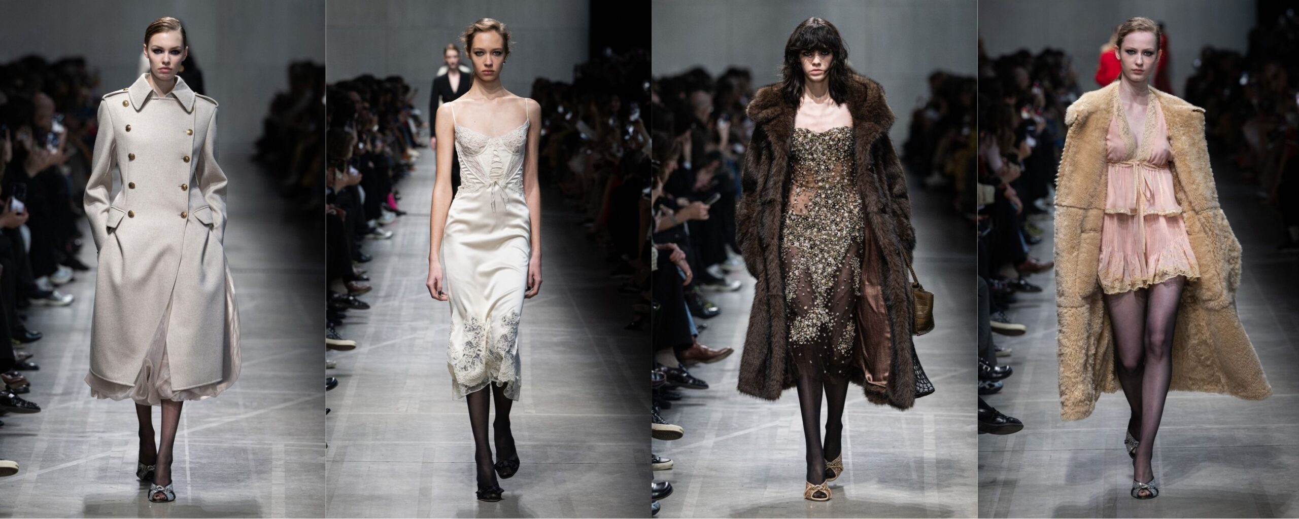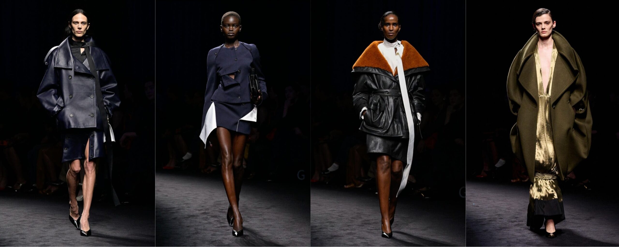 Maximilian Davis continua a lavorare per sottrazione, ma con una sicurezza sempre più matura. L’ispirazione nautica è chiara e ben calibrata: caban, giacche e cappotti in stile marinaio vengono smontati e ricomposti, con bottoni spostati, lacci lasciati aperti e dettagli destrutturati che alleggeriscono la rigidità dell’idea di divisa. Mi è piaciuto molto il modo in cui gli abiti si sbottonano e restano aperti, con i revers pendenti, come se la costruzione dialogasse continuamente con il movimento del corpo. Le giacche in pelle sono tra i capi che ho apprezzato di più: tagli dei colli decisi, revers molto ampi, talvolta foderati in pelliccia a contrasto, sensuali ma mai ostentati. Tra tutti, continuo a pensare che il cappotto a uovo sarà uno dei veri bestseller della collezione. Anche le scarpe seguono la stessa logica di eleganza funzionale: forme essenziali, solide, con richiami agli archivi Ferragamo ma senza nostalgia. Tacchi misurati, slingback e modelli che sembrano pensati per accompagnare il passo più che per imporsi, perfettamente coerenti con l’idea di una sensualità silenziosa e controllata. Ferragamo non cerca l’effetto immediato. È una collezione che resta, che si fa ricordare per coerenza e misura.