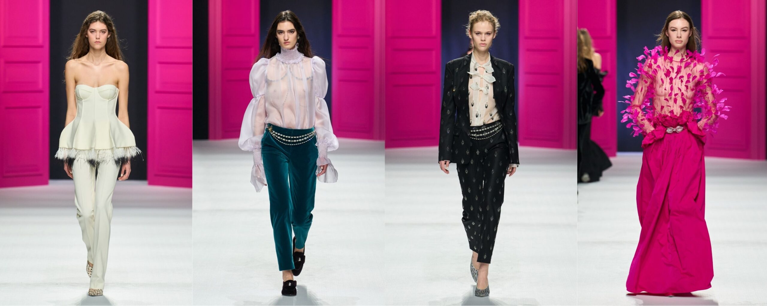 Il gusto edwardiano esplode in volant e ruches che definiscono volumi importanti ma mai esagerati. Mentre guardavo il fashion show ho percepito subito un equilibrio molto interessante tra rigore e fioritura. La sartoria accompagna la silhouette con disciplina, tra corsetteria, completi impeccabili e velluto, mentre improvvisamente tutto si apre in petali tridimensionali, volant e ruches dal gusto quasi edwardiano. I volumi sono importanti ma mai eccessivi, sempre controllati. La palette è viva — dal fucsia all’ottanio — in contrasto netto con bianco e nero, mentre un accenno di animalier attraversa la collezione con misura.