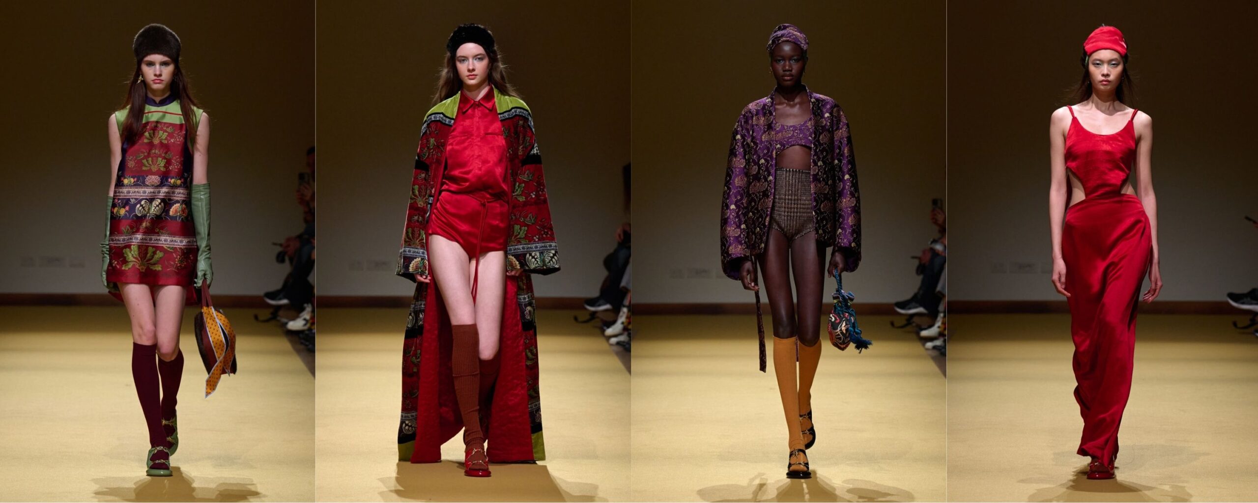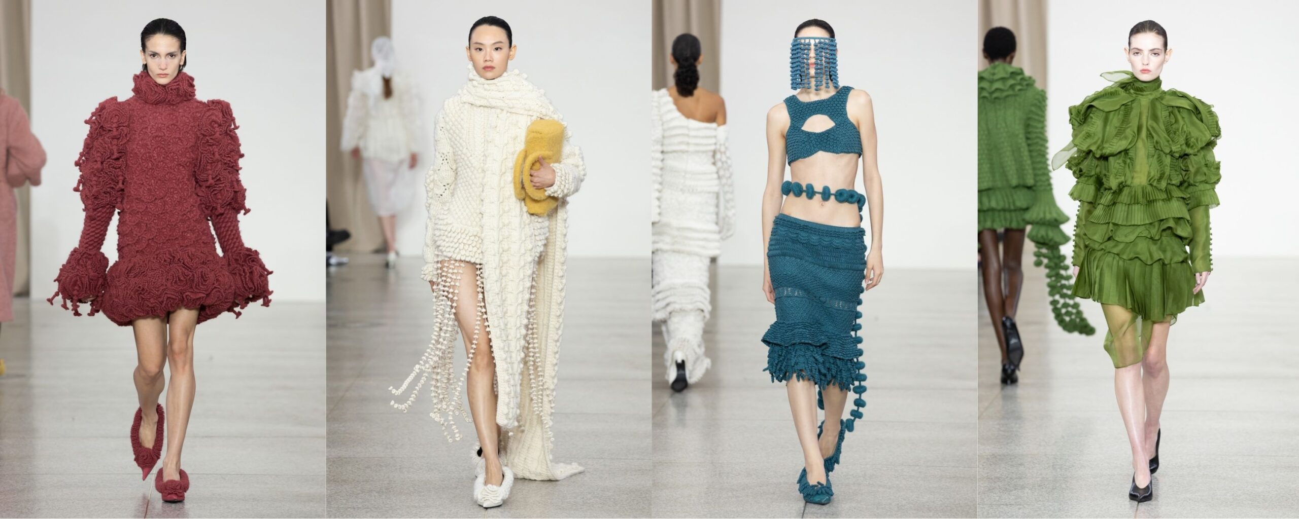 La sfilata di HUI è stata una delle mie preferite dell’intero calendario. Her Threads non è solo una collezione, ma un racconto stratificato che parla di memoria, identità e forza femminile. Huizhou Zhao riesce a trasformare una tradizione intima, come il Nü Gong, in un linguaggio contemporaneo e profondamente universale. Jacquard multicolor, ricchi ma mai ridondanti, e la palette costruita ad arte, con il rosso a predominare. I tagli ispirati alla tradizione orientale dialogano con naturalezza con elementi occidentali, come l’abbinamento sorprendente tra jacquard e tartan, che funziona proprio perché non cerca armonia facile, ma equilibrio. I lunghissimi kimono con stampe botaniche sono stati tra i momenti più poetici della sfilata: capi che si muovono lentamente, carichi di simboli, ma estremamente contemporanei nel gesto.