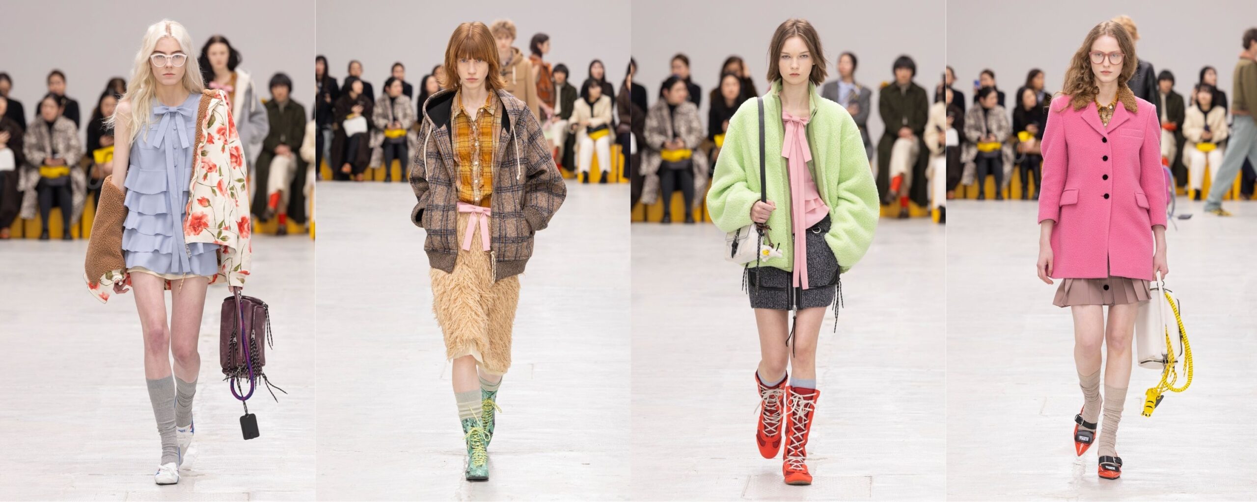 Alle sette di sera ho raggiunto il mio seat alla sfilata di Onitsuka Tiger (dove peraltro ho trovato un cadeau davvero adorabile! Una piccola spazzola del giallo signature del brand a forma di cuore!). Mentre guardavo lo show ho subito percepito la sensazione di trovarmi in quello spazio di mezzo dove le cose non sono mai una sola cosa. È una collezione che non ha bisogno di occasioni precise per esistere: vive di attitude. Ed è proprio questo che mi ha conquistata. Lo sportswear dialoga con la sartoria in modo naturale, mai forzato, dando vita a un nuovo modo di essere preppy. Le felpe si indossano sopra abitini leggeri, con volumi morbidi, ruches e richiami vittoriani; il tailoring resta preciso ma si lascia contaminare da tartan, piume, stratificazioni inattese. È un’eleganza che non si prende troppo sul serio, ma sa esattamente dove vuole andare. Le vere protagoniste, però, per me sono state le scarpe. Le iconiche Mexico 66 che diventano Boxing, proposte con stampe floreali vintage, pitonate e colori sgargianti che accendono l’intero look. Una dichiarazione di carattere, da indossare senza timidezze. Funzionano allo stesso modo anche le Mexico 66 trasformate in pumps, da portare rigorosamente con calzettoni spessi: un dettaglio che sposta tutto e rende l’insieme sorprendentemente contemporaneo. Andrea Pompilio firma per Onitsuka Tiger una collezione effervescente, fatta di contaminazioni e libertà, che trova forza proprio nel non scegliere un’unica direzione.