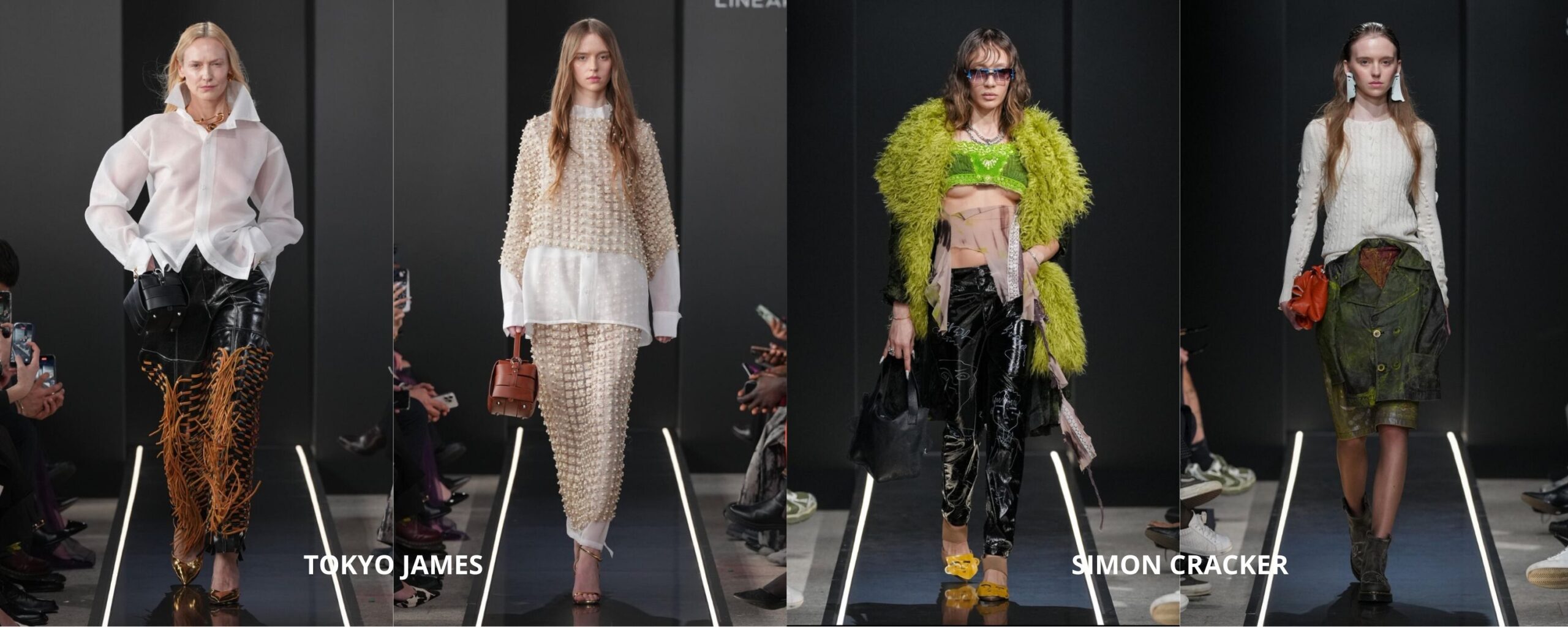 Durante la giornata di sabato sono tornata due volte da Spazio Lineapelle, uno di quei luoghi che riescono davvero a creare un contesto diverso, più libero e sperimentale. Qui la pelle diventa linguaggio e non semplice materia, e le sfilate di Tokyo James e Simon Cracker lo hanno dimostrato in modi molto diversi ma ugualmente interessanti. Da Tokyo James mi ha colpita soprattutto la qualità del lavoro sul layering, sempre sorprendente, costruito con una palette viva e con dettagli preziosi che non risultano mai decorativi, come i tessuti interamente rivestiti di perle. Il pezzo che continuo a ripensare è il pantalone della prima uscita: in pelle, con stringhe di pelle scamosciata a contrasto che, muovendosi, creavano un effetto drammatico e fortemente scenico. Un capo pensato per il movimento, capace di trasformare il passo in gesto. Con Simon Cracker il registro cambia completamente. Qui il focus è sulla decostruzione, sul riuso, su un’idea di moda lenta e consapevole che non rinuncia però all’ironia e alla forza visiva. I capi sembrano portare addosso una storia già vissuta, riassemblata con intelligenza e senso critico. È una moda che chiede di essere guardata con attenzione, perché il messaggio sta nei dettagli e nel processo, prima ancora che nell’immagine finale.