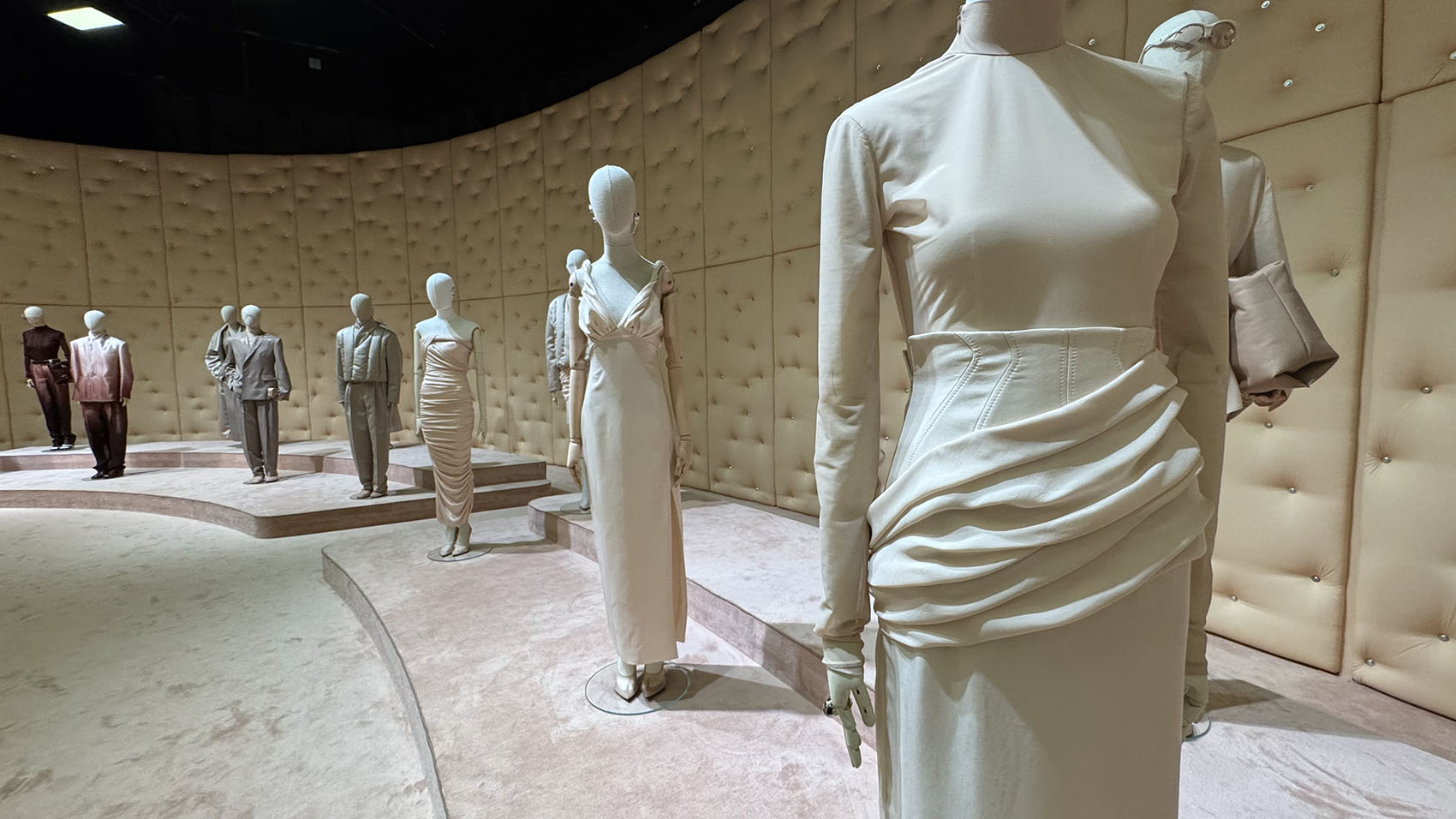Poco prima di raggiungere il resee Ferrari, avevo scrollato tutte le immagini della sfilata sui social. Ok, le foto ed i video non rendono assolutamente giustizia a questi incredibili pezzi. Anzitutto l’esperienza tattile: la pelle e morbidissima, confortevole da indossare. Delicata nei suoi drappeggi e nelle nuances mai chiassose. Uno splendido rosa matte (che dalle foto sembra beige, ma vi assicuro che non lo è) che rende delicata e femminile ogni creazione. Le silhouette sono plasmate per seguire la fisicità senza alterarla, ponendo tocchi di volume lì dove amiamo portare un po’ di enfasi. È in realtà una sfilata molto intima ed introspettiva, dove la pelle è intesa probabilmente come quel manto che accarezza l’animo umano. Ci si sposta, poi, verso colori caldi e terrosi come il cioccolato fino ad arrivare a guizzi di rosso Ferrari. Fra i pezzi forti anche andranno sicuramente a ruba l’abito drappeggiato in cupro e jersey stretch che abbiamo visto indossato da Mariacarla Boscono. Le pieghe diagonali costruiscono la silhouette senza costringerla, disegnando un movimento fluido e sensuale. La sua linea essenziale lascia parlare la materia e il gesto. Un abito che non cerca l’effetto, ma la presenza. Nota di merito anche per le pumps dal taglio asimmetrico in PVC semi-trasparente: a differenza di molte scarpe in questo materiale, la finitura completamente matte le rende sorprendentemente eleganti.